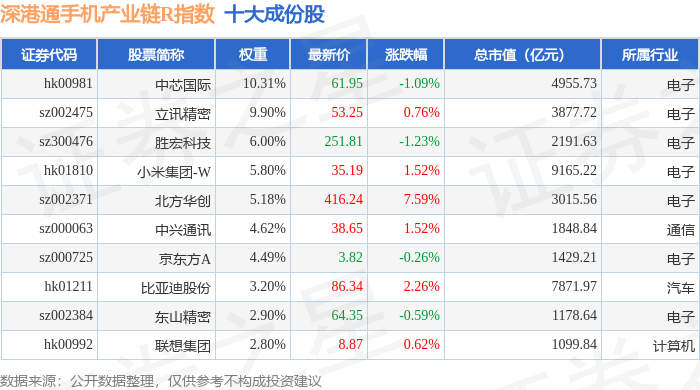 深港通手机产业链R(483009)指数十大成份股详情如下: