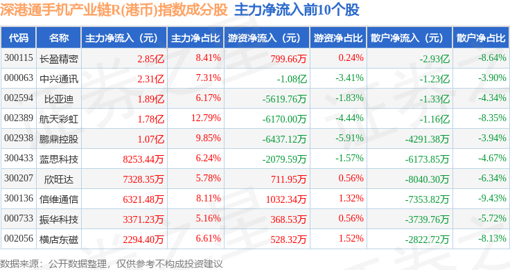 资金流向方面,深港通手机产业链R(港币)(483010)指数成份股当日主力资金净流入合计2.01亿元,游资资金净流出合计3.82亿元,散户资金净流入合计1.82亿元。成份股资金流向详情见下表: