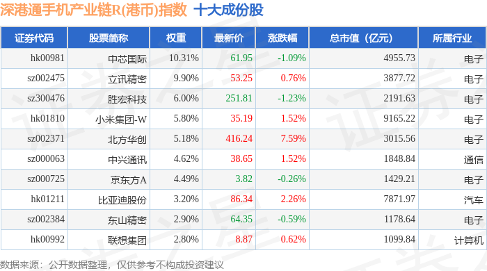 深港通手机产业链R(港币)(483010)指数十大成份股详情如下:
