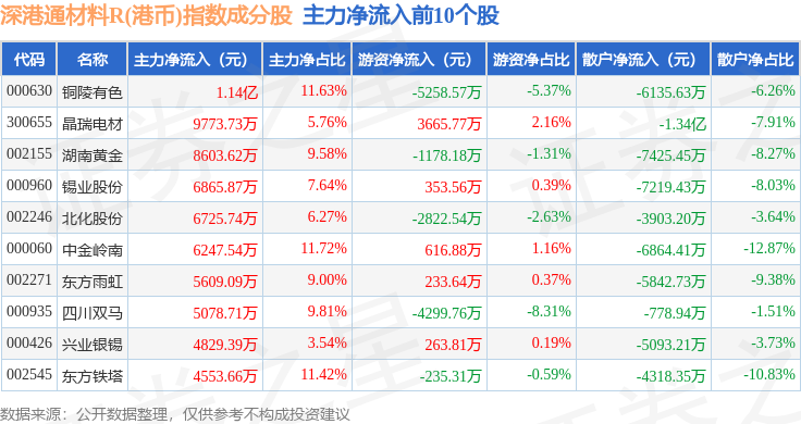 资金流向方面,深港通材料R(港币)(483016)指数成份股当日主力资金净流出合计27.2亿元,游资资金净流出合计1.12亿元,散户资金净流入合计28.32亿元。成份股资金流向详情见下表:
