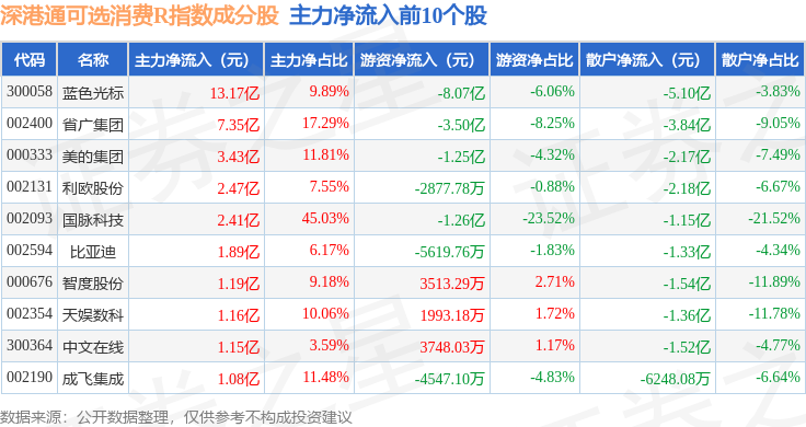 资金流向方面,深港通可选消费R(483019)指数成份股当日主力资金净流入合计16.11亿元,游资资金净流出合计15.02亿元,散户资金净流出合计1.09亿元。成份股资金流向详情见下表: