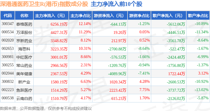资金流向方面,深港通医药卫生R(港币)(483024)指数成份股当日主力资金净流出合计10.34亿元,游资资金净流出合计1.01亿元,散户资金净流入合计11.35亿元。成份股资金流向详情见下表:
