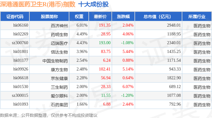 深港通医药卫生R(港币)(483024)指数十大成份股详情如下: