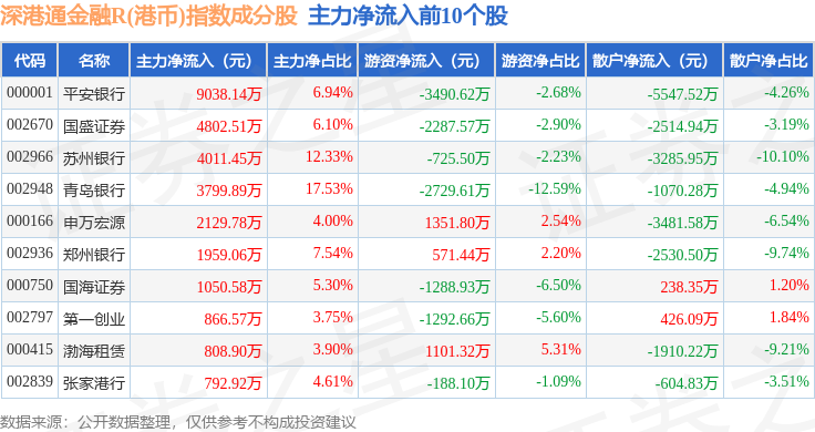 资金流向方面,深港通金融R(港币)(483026)指数成份股当日主力资金净流出合计2.32亿元,游资资金净流出合计1560.6万元,散户资金净流入合计2.48亿元。成份股资金流向详情见下表: