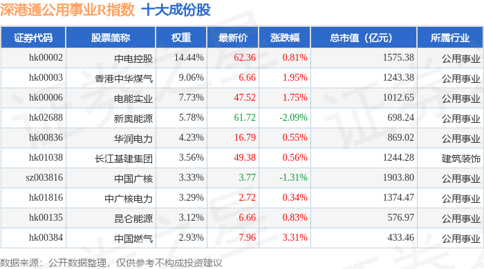 深港通公用事业R(483031)指数十大成份股详情如下: