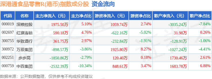 资金流向方面,深港通食品零售R(港币)(483038)指数成份股当日主力资金净流出合计2354.39万元,游资资金净流入合计3099.55万元,散户资金净流出合计745.17万元。成份股资金流向详情见下表: