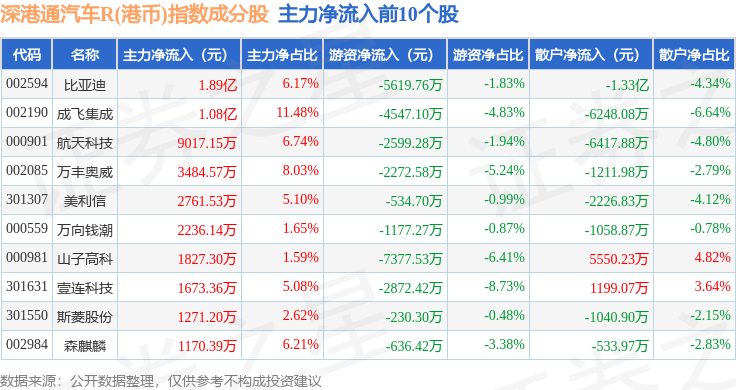 资金流向方面,深港通汽车R(港币)(483040)指数成份股当日主力资金净流出合计2.86亿元,游资资金净流出合计2.87亿元,散户资金净流入合计5.73亿元。成份股资金流向详情见下表: