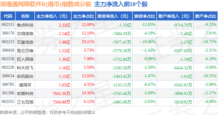 资金流向方面,深港通网络软件R(港币)(483048)指数成份股当日主力资金净流入合计3.44亿元,游资资金净流出合计12.37亿元,散户资金净流入合计8.93亿元。成份股资金流向详情见下表: