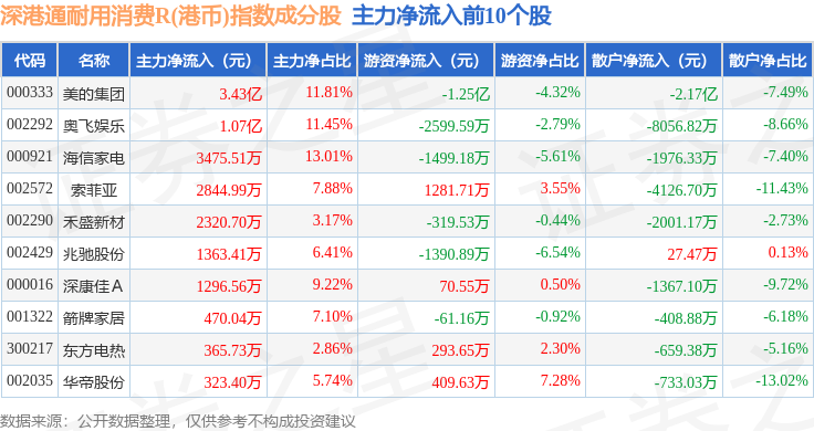 资金流向方面,深港通耐用消费R(港币)(483050)指数成份股当日主力资金净流入合计3996.11万元,游资资金净流出合计1.44亿元,散户资金净流入合计1.04亿元。成份股资金流向详情见下表: