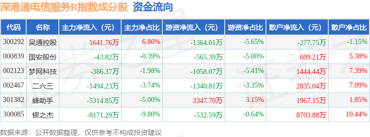 资金流向方面,深港通电信服务R(483057)指数成份股当日主力资金净流出合计1.38亿元,游资资金净流出合计1513.16万元,散户资金净流入合计1.53亿元。成份股资金流向详情见下表: