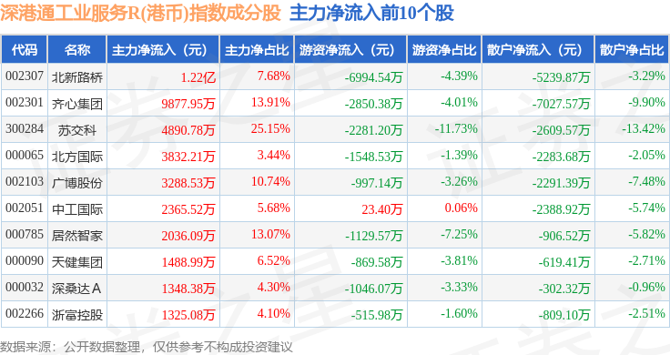 资金流向方面,深港通工业服务R(港币)(483056)指数成份股当日主力资金净流出合计3.57亿元,游资资金净流出合计9875.97万元,散户资金净流入合计4.56亿元。成份股资金流向详情见下表: