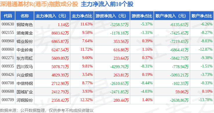 资金流向方面,深港通基材R(港币)(483062)指数成份股当日主力资金净流出合计14.02亿元,游资资金净流出合计1.89亿元,散户资金净流入合计15.91亿元。成份股资金流向详情见下表: