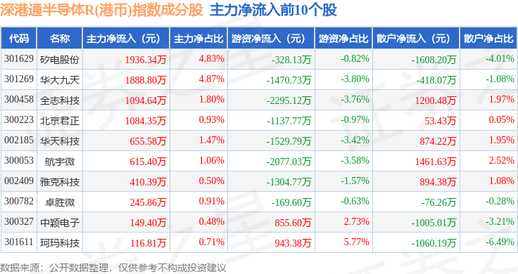 资金流向方面,深港通半导体R(港币)(483068)指数成份股当日主力资金净流出合计7.69亿元,游资资金净流入合计3637.83万元,散户资金净流入合计7.33亿元。成份股资金流向详情见下表: