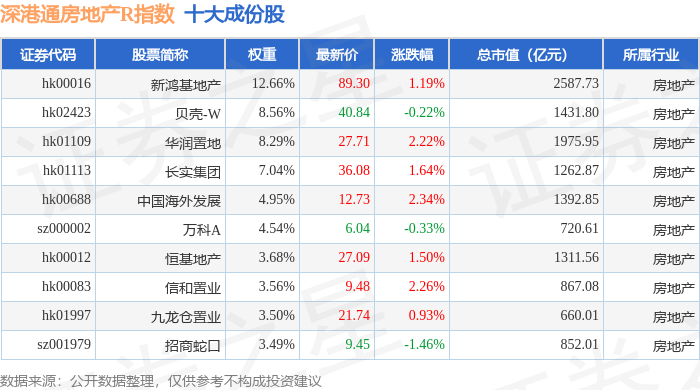 深港通房地产R(483071)指数十大成份股详情如下: