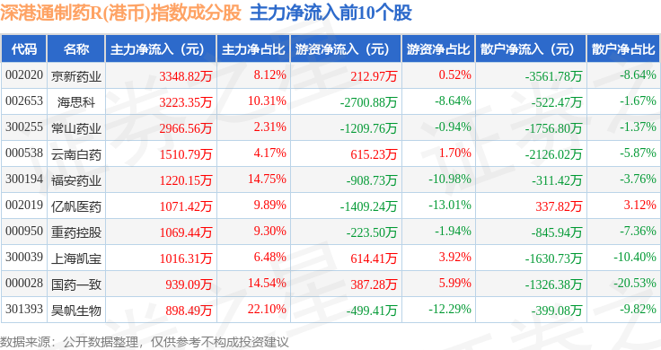 资金流向方面,深港通制药R(港币)(483080)指数成份股当日主力资金净流出合计4.04亿元,游资资金净流出合计1.63亿元,散户资金净流入合计5.67亿元。成份股资金流向详情见下表: