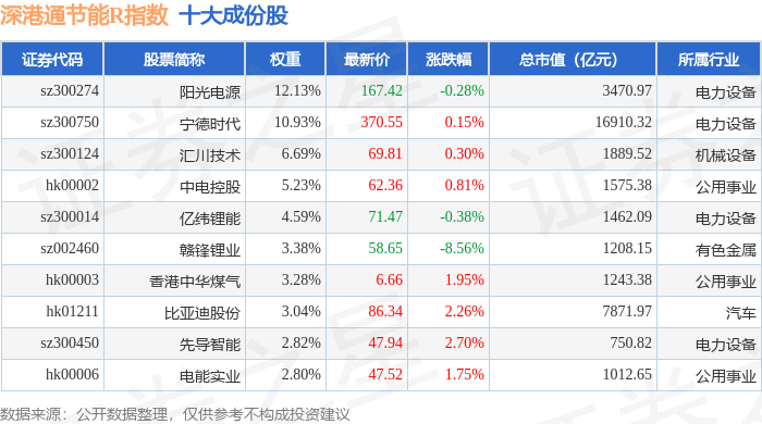 证券之星消息,11月24日,深港通节能R(483085)指数报收于2736.63点,跌0.42%,成交776.77亿元,换手率1.09%。当日该指数成份股中,上涨的有26家,金风科技以3.15%的涨幅领涨,下跌的有24家,赣锋锂业以8.56%的跌幅领跌。