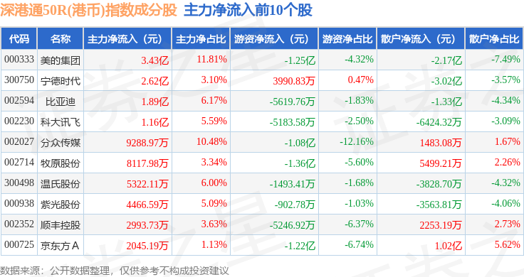 资金流向方面,深港通50R(港币)(483092)指数成份股当日主力资金净流出合计11.27亿元,游资资金净流入合计11.82亿元,散户资金净流出合计5447.32万元。成份股资金流向详情见下表: