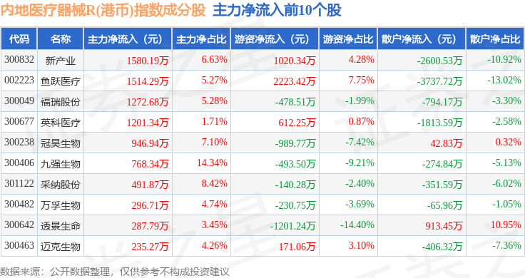资金流向方面,内地医疗器械R(港币)(483104)指数成份股当日主力资金净流出合计2.53亿元,游资资金净流出合计5888.93万元,散户资金净流入合计3.12亿元。成份股资金流向详情见下表: