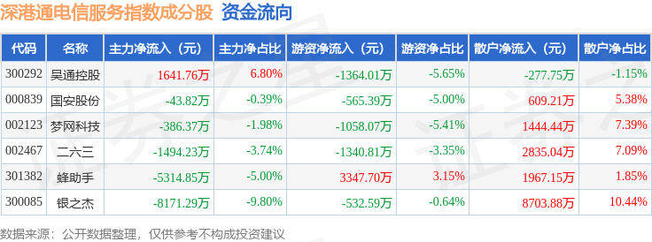 资金流向方面,深港通电信服务(983057)指数成份股当日主力资金净流出合计1.38亿元,游资资金净流出合计1513.16万元,散户资金净流入合计1.53亿元。成份股资金流向详情见下表: