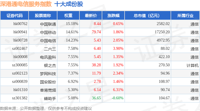 深港通电信服务(983057)指数十大成份股详情如下: