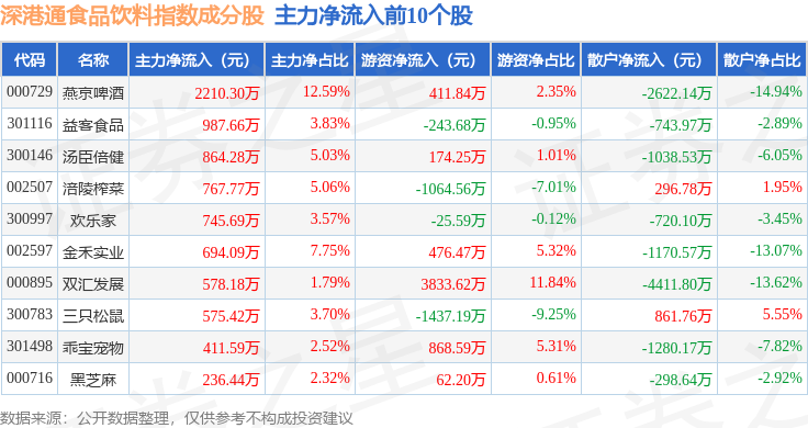 资金流向方面,深港通食品饮料(983065)指数成份股当日主力资金净流出合计5.15亿元,游资资金净流入合计2.64亿元,散户资金净流入合计2.51亿元。成份股资金流向详情见下表: