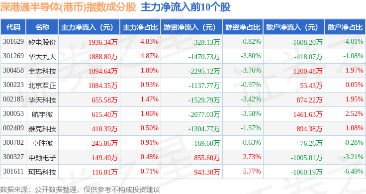 资金流向方面,深港通半导体(港币)(983068)指数成份股当日主力资金净流出合计7.69亿元,游资资金净流入合计3637.83万元,散户资金净流入合计7.33亿元。成份股资金流向详情见下表: