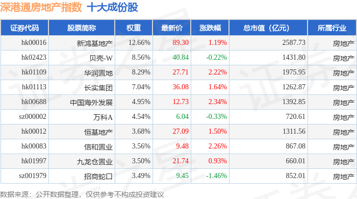 深港通房地产(983071)指数十大成份股详情如下: