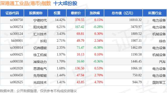 深港通工业品(港币)(983070)指数十大成份股详情如下: