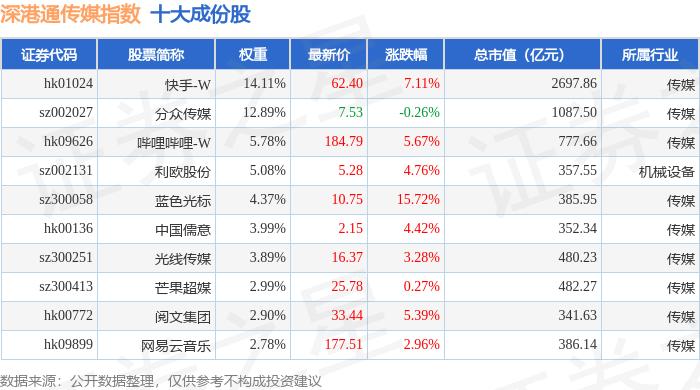 证券之星消息,11月24日,深港通传媒(983075)指数报收于2206.8点,涨4.17%,成交599.29亿元,换手率4.55%。当日该指数成份股中,上涨的有43家,蓝色光标以15.72%的涨幅领涨,下跌的有2家,汇量科技以10.22%的跌幅领跌。