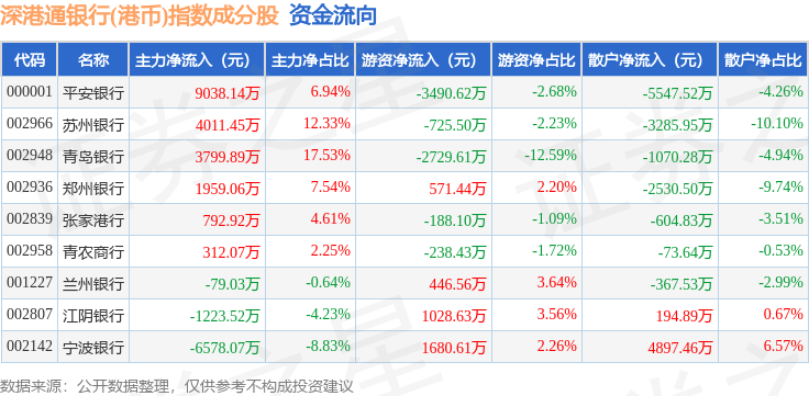 资金流向方面,深港通银行(港币)(983082)指数成份股当日主力资金净流入合计1.2亿元,游资资金净流出合计3645.02万元,散户资金净流出合计8387.9万元。成份股资金流向详情见下表: