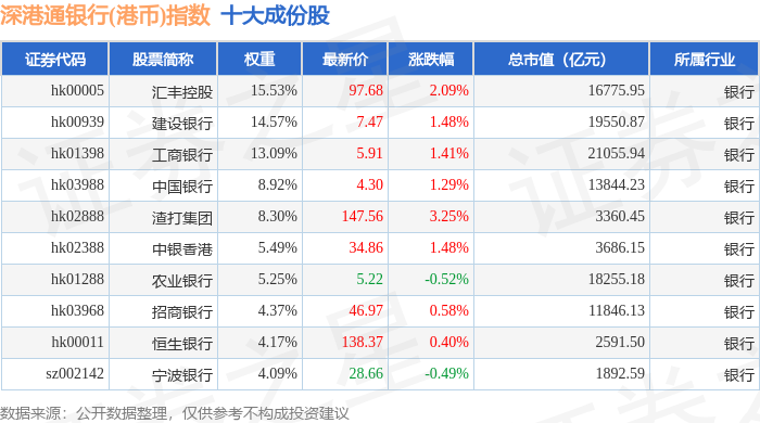 深港通银行(港币)(983082)指数十大成份股详情如下: