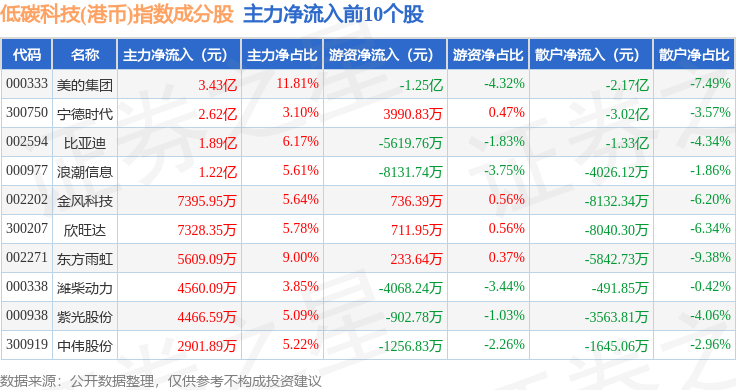 资金流向方面,低碳科技(港币)(983161)指数成份股当日主力资金净流出合计7.88亿元,游资资金净流入合计1.3亿元,散户资金净流入合计6.58亿元。成份股资金流向详情见下表:
