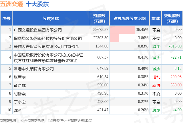 证券之星消息,11月24日五洲交通发布公告《五洲交通:五洲交通持股5%以上的股东权益变动触及1%刻度的提示性公告》,其股东广西交通投资集团有限公司于2025年10月21日至2025年11月21日间合计增持1634.77万股,占公司目前总股本的1.0156%,变动期间该股股价下跌6.13%,截止11月21日收盘报3.98元。