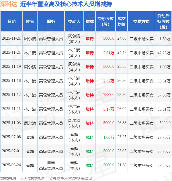 深科达近半年内的董监高及核心技术人员增减持详情如下: