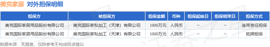美克家居11月21日披露2笔对外担保,被担保方为美克国际家私加工(天津)有限公司。对外担保明细如下表: