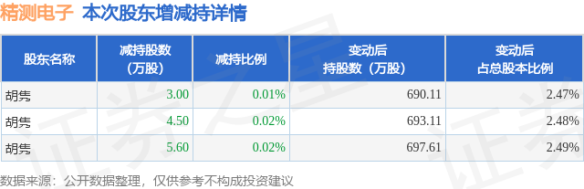 证券之星消息,11月24日精测电子发布公告《精测电子:武汉精测电子集团股份有限公司关于公司特定股东减持计划期限届满暨实施情况的公告》,其股东胡隽于2025年11月19日至2025年11月21日间合计减持13.1万股,占公司目前总股本的0.0468%,变动期间该股股价下跌8.13%,截止11月21日收盘报64.32元。