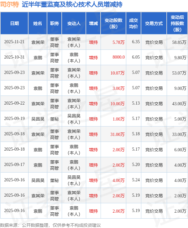 司尔特近半年内的董监高及核心技术人员增减持详情如下: