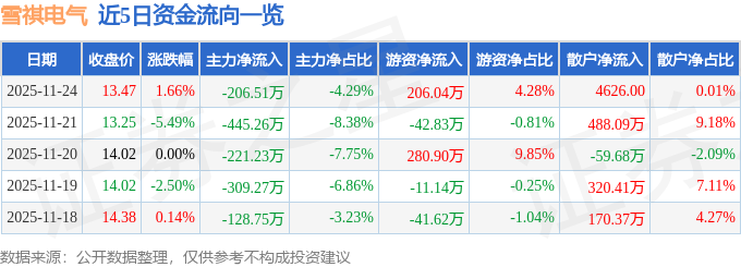 证券之星消息,截至2025年11月24日收盘,雪祺电气(001387)报收于13.47元,上涨1.66%,换手率3.14%,成交量3.58万手,成交额4809.85万元。