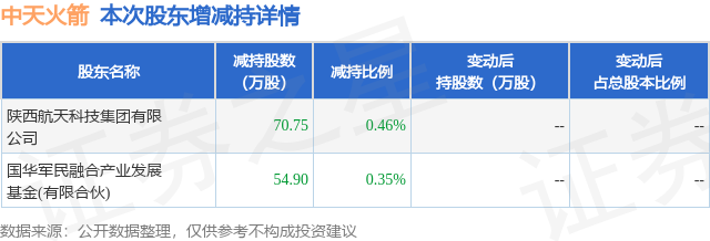 证券之星消息,11月24日中天火箭发布公告《中天火箭:陕西中天火箭技术股份有限公司关于持股5%以上股东及其一致行动人持股比例变动触及1%整数倍的公告》,其股东陕西航天科技集团有限公司、国华军民融合产业发展基金(有限合伙)于2025年11月24日合计减持125.65万股,占公司目前总股本的0.8086%,变动期间该股股价上涨10.0%,截止11月24日收盘报55.1元。