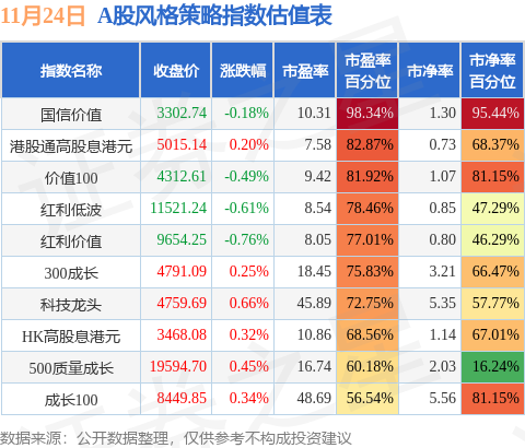 风格策略指数方面,国信价值的市盈率百分位较高,为98.34%。而成长100的市盈率百分位较低,为56.54%。