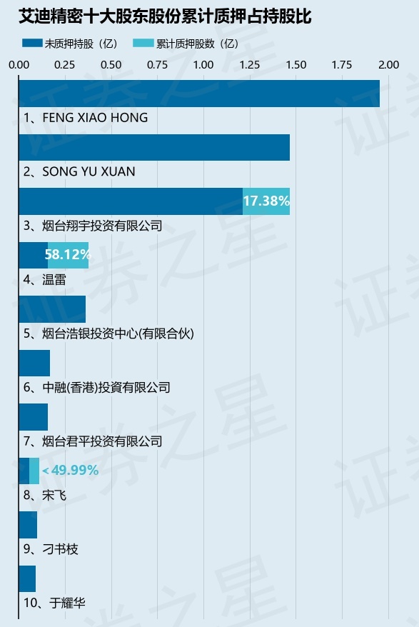 截止本公告日,股东烟台翔宇投资有限公司已累计质押股份2550.0万股,占其持股总数的17.38%,股东温雷已累计质押股份2188.78万股,占其持股总数的58.12%,股东宋飞已累计质押股份567.0万股,占其持股总数的49.99%。本次质押后艾迪精密十大股东的累计质押股份占持股比例(占持股比例的计算以公司最新一期财务报表公布的十大股东的持股总数为基准)见下图: