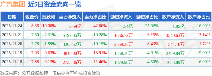 证券之星消息,截至2025年11月24日收盘,广汽集团(601238)报收于8.36元,上涨10.0%,涨停,换手率1.0%,成交量73.72万手,成交额6.16亿元。