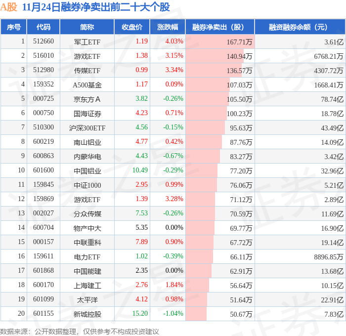 A股融券净卖出前三分别为:军工ETF(512660)融券净卖出167.71万股、游戏ETF(516010)融券净卖出140.94万股、传媒ETF(512980)融券净卖出136.57万股,前20具体见下表: