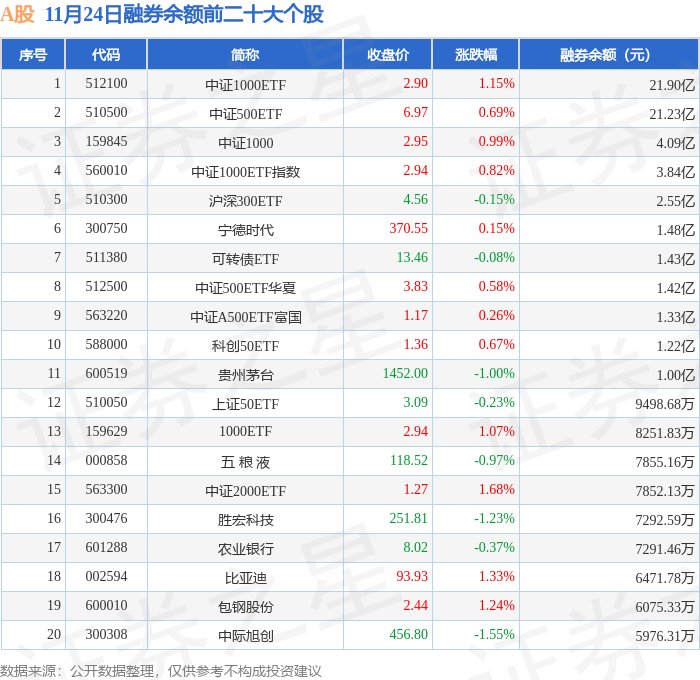 A股融券余额前三分别为:中证1000ETF(512100)融券余额21.9亿元、中证500ETF(510500)融券余额21.23亿元、中证1000(159845)融券余额4.09亿元,前20具体见下表: