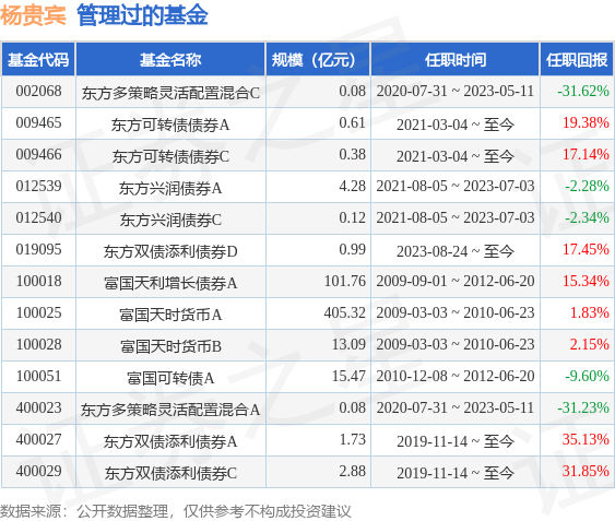 杨贵宾先生:中国国籍。西安交通大学应用经济学博士,曾任富国基金管理有限公司固定收益研究员、基金经理,上海海通证券资产管理有限责任公司投资主办、固定收益投资总监、公司总助职位。2009年3月至2010年6月任富国天时基金经理;2009年9月起任富国天利基金经理;2010年12月起任富国可转债基金经理。具有基金从业资格。2019年9月加盟东方基金管理股份有限公司担任公司副总经理、固定收益投资总监、公募投资决策委员会副主任委员,曾任公司总经理助理,现任东方双债添利债券型证券投资基金基金经理、东方多策略灵活配置混合型证券投资基金基金经理、东方可转债债券型证券投资基金基金经理。曾任东方兴润债券型证券投资基金基金经理。