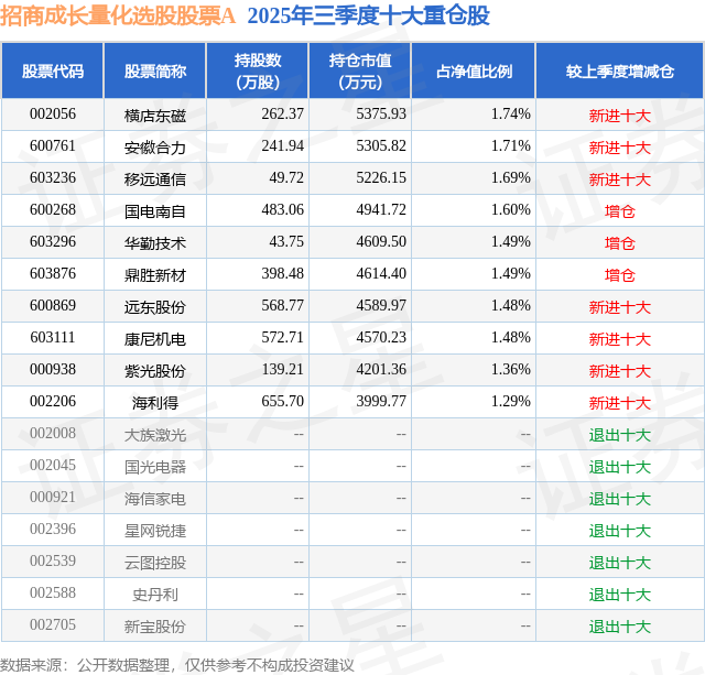 根据2025基金Q3季报公募基金重仓股数据,重仓该股的公募基金共2家,其中持有数量最多的公募基金为招商基金的招商成长量化选股股票A。招商成长量化选股股票A目前规模为14.95亿元,最新净值1.4658(11月24日),较上一交易日上涨1.23%,近一年上涨35.53%。该公募基金现任基金经理为王平。王平在任的基金产品包括:招商量化精选股票A,管理时间为2016年3月15日至今,期间收益率为247.54%;招商沪深300指数增强A,管理时间为2017年2月10日至今,期间收益率为73.98%;招商中证红利ETF,管理时间为2019年11月28日至今,期间收益率为103.59%;招商中证光伏产业指数A,管理时间为2021年6月18日至今,期间收益率为-34.79%。