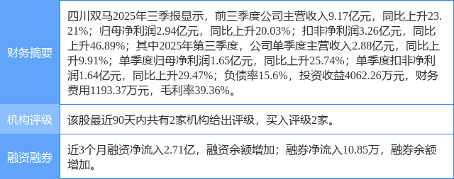 2025年10月31日,国金证券研究员舒思勤,方丽,洪希柠,夏昌盛,李阳,马居东发布了对四川双马的研报《投资收益表现亮眼,前三季度业绩同比双位数增长》,该研报对四川双马给出“买入”评级。证券之星数据中心根据近三年发布的研报数据计算,该研报作者对此股的盈利预测准确度为68.98%。