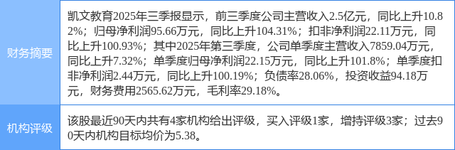 2025年10月28日,民生证券研究员苏多永发布了对凯文教育的研报《2025年三季报点评:招生良好拐点已现,培育第二增长曲线》,该研报对凯文教育给出“买入”评级。研报中预计2025-2027年公司营收分别为3.68亿元、4.15亿元和4.65亿元,EPS分别为0.03元、0.08和0.17元,对应当前股价动态PE分别为195倍、72倍和35倍。公司招生整体良好,经营拐点已现,合同负债、现金流等较好,且牵手智谱华章,战略布局AI+教育,培养第二增长曲线,我们看好公司平台价值和未来成长性,维持“推荐”评级。证券之星数据中心根据近三年发布的研报数据计算,该研报作者对此股的盈利预测准确度为71.42%。
