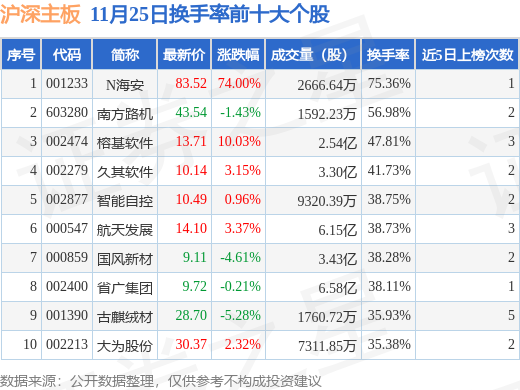 当日沪深主板换手率前10大个股中6只个股收涨,平均涨幅15.64%,其中N海安(001233)以换手率75.36%排第一,8只个股近5个交易日中多次上榜。