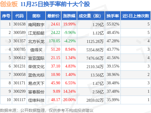 当日创业板换手率前10大个股中8只个股收涨,平均涨幅9.67%,其中南网数字(301638)以换手率55.02%排第一,8只个股近5个交易日中多次上榜。